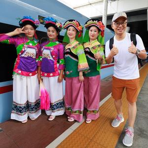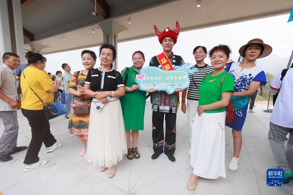 8月8日,旅客在荔波站內和身着民族特色服裝的工作人員合影。