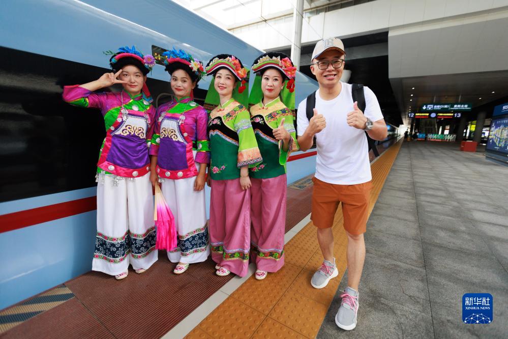 8月8日,身着少數民族特色服裝的工作人員在D6155次列車旁迎接旅客。