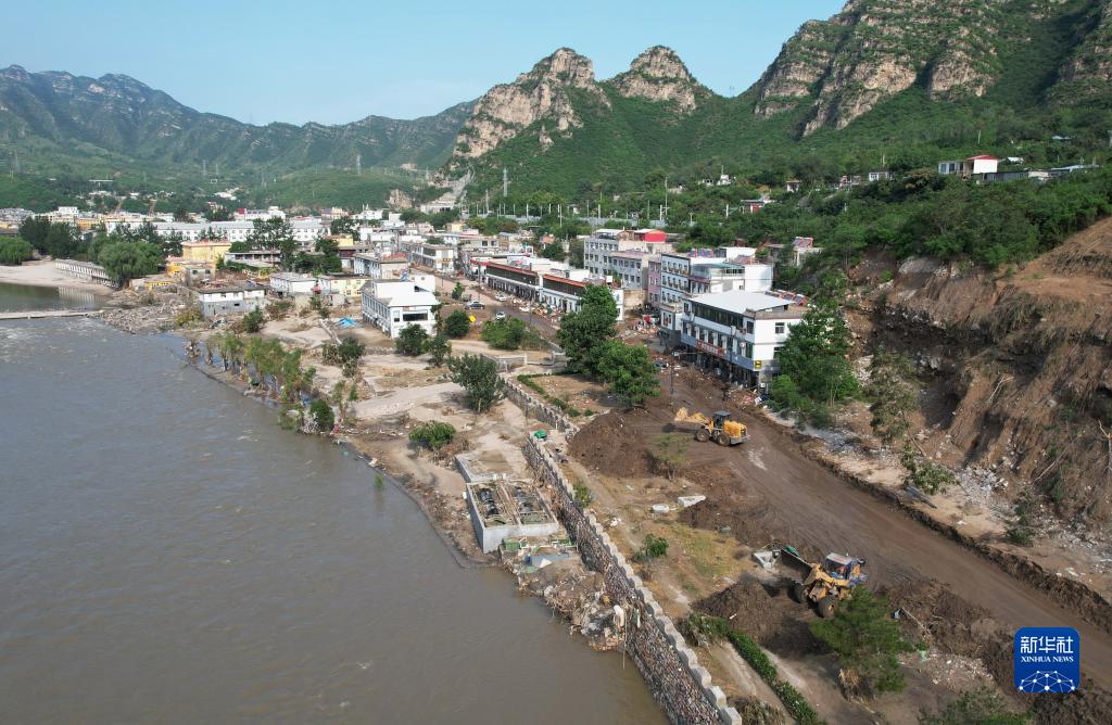 8月8日,在淶水縣三坡鎮下莊村,工人操作機械設備清理道路上的淤泥(無人機照片)。