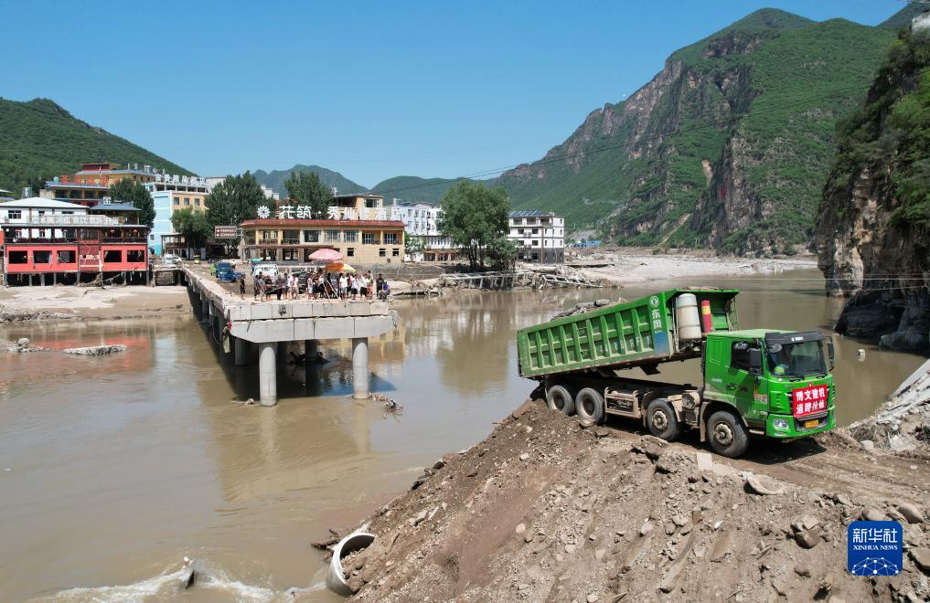 8月8日,工人操作機械設備搶修通往淶水縣三坡鎮劉家河村的橋梁(無人機照片)。