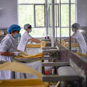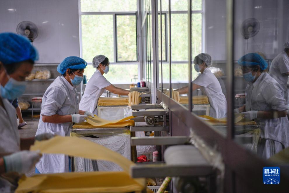8月8日,在承德市雙灤區西地鎮一家豆片加工企業,工人在生産線上擺放豆片。