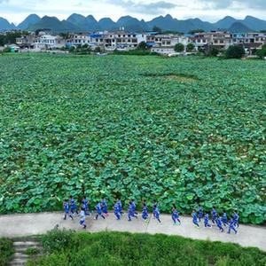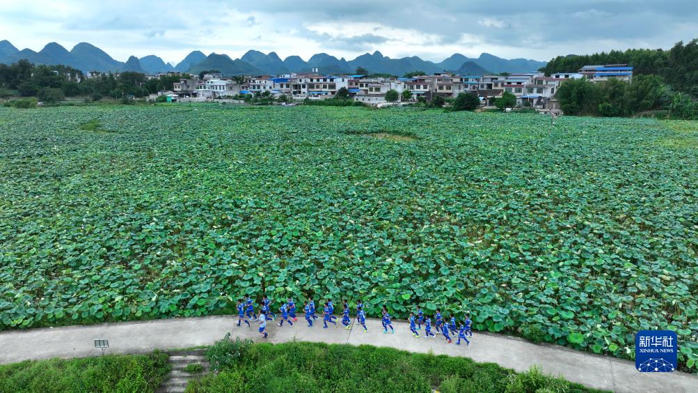 8月7日傍晚,孩子們在荷塘邊跑步鍛煉體能(無人機照片)。