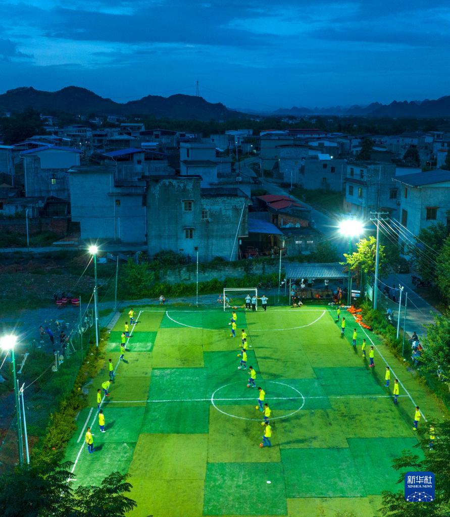 平地屯是位於廣西柳州市柳江區穿山鎮的一個小山村。8月7日晚,為期近1個月的平地屯暑期公益足球夏令營結束,一場匯報訓練成果的足球對抗賽在村裏的綠茵場上打響,吸引眾多村民觀賽。2020年,平地屯的村民組成義務勞動隊,為孩子們修建專用足球場,社會愛心人士為他們捐贈了人工草坪、球門、球場照明燈等設施,公益足球教練定期免費為孩子們培訓,眾人聯合起來,給村裏喜歡足球的孩子們點燃了綠茵夢想。