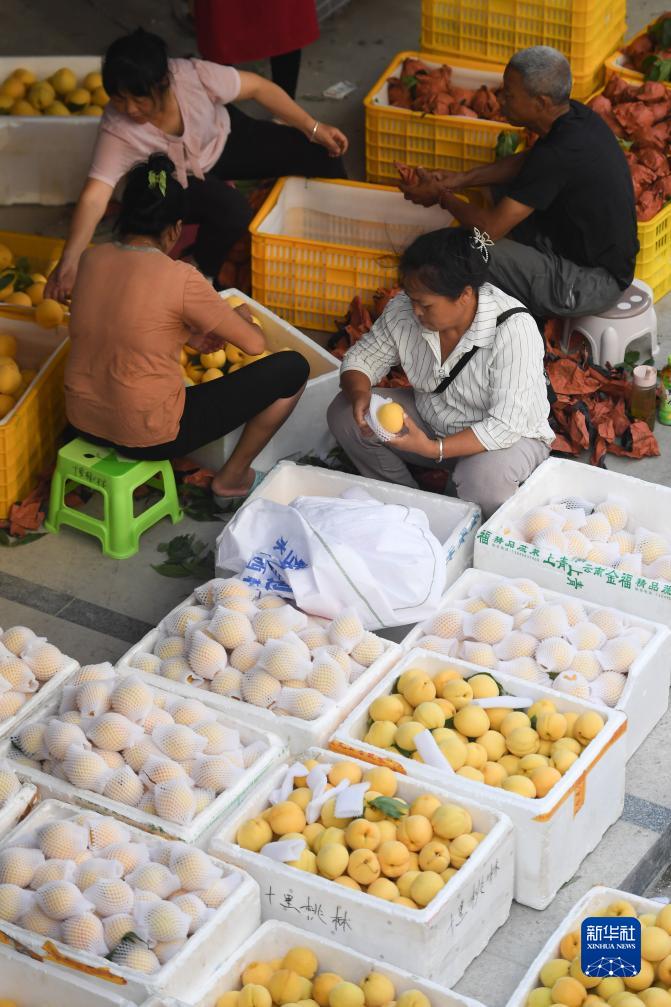 8月7日,桃農在炎陵縣水口鎮黃桃市場挑選黃桃並打包。