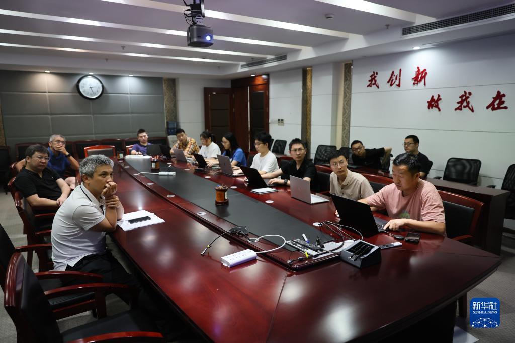 7月22日,在中國科學技術大學上海研究院,彭承志(前左)在參加組會。