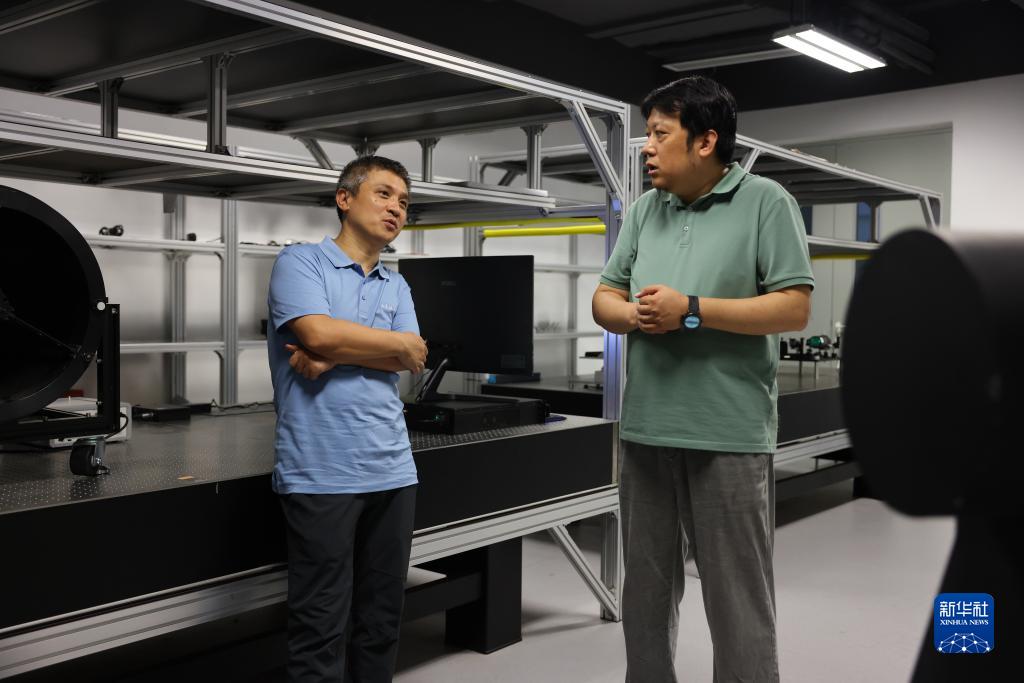 7月21日,在位於安徽合肥的中國科學技術大學先進技術研究院,彭承志(左)與任繼剛教授交流衛星地面站運行情況。