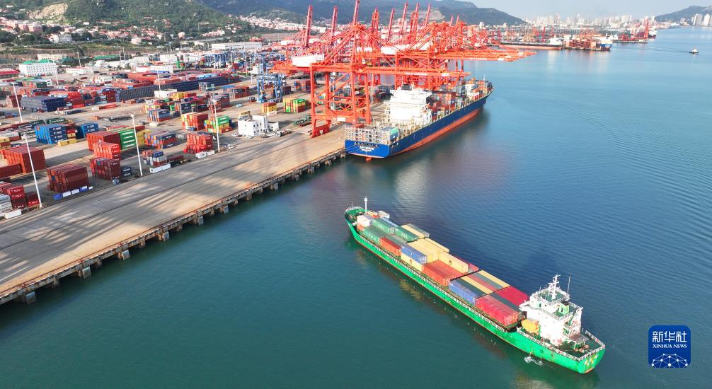 8月8日,在江蘇連雲港港,進港貨輪緩緩停靠碼頭(無人機照片)。