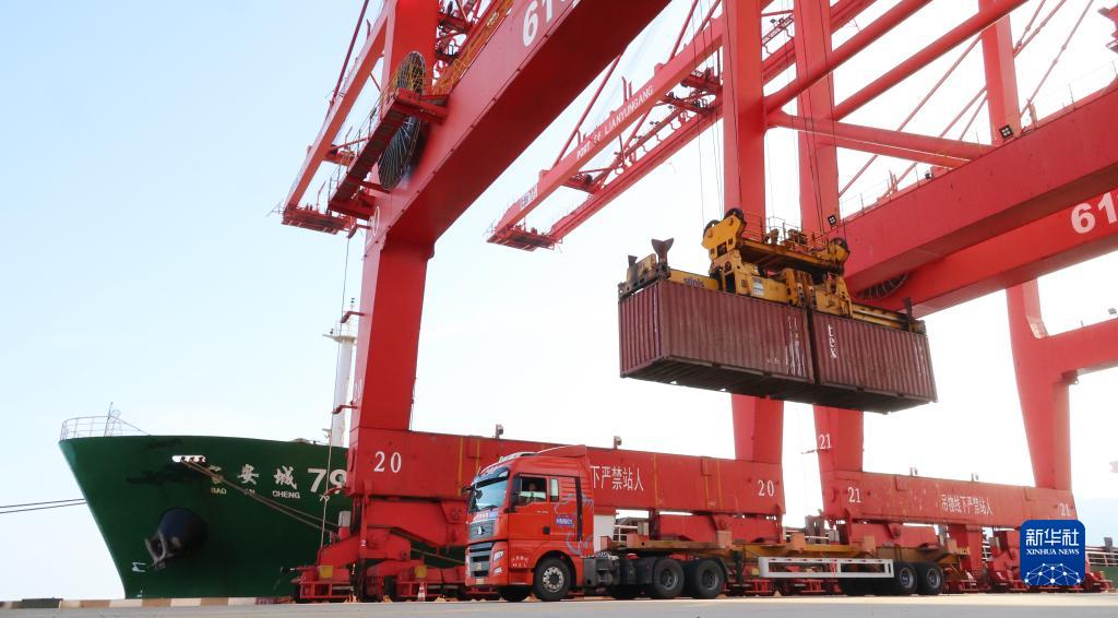 8月8日,在江蘇連雲港港,貨輪在進行裝卸作業。