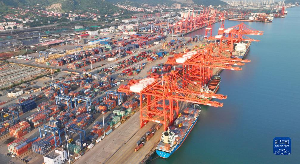 8月8日,在江蘇連雲港港,貨輪在進行裝卸作業(無人機照片)。
