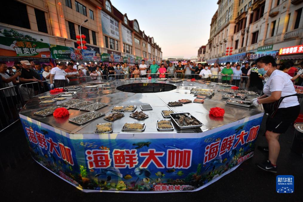 8月6日晚,在山東省青島市城陽區舉行的首屆青島國際海鮮節活動上,游客在參觀直徑6米的海鮮蒸鍋。