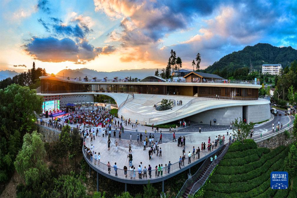8月4日傍晚,游客在湖北省宜昌市夷陵區“雲居鄧村 遇見清涼”納涼季上游玩(無人機照片)。