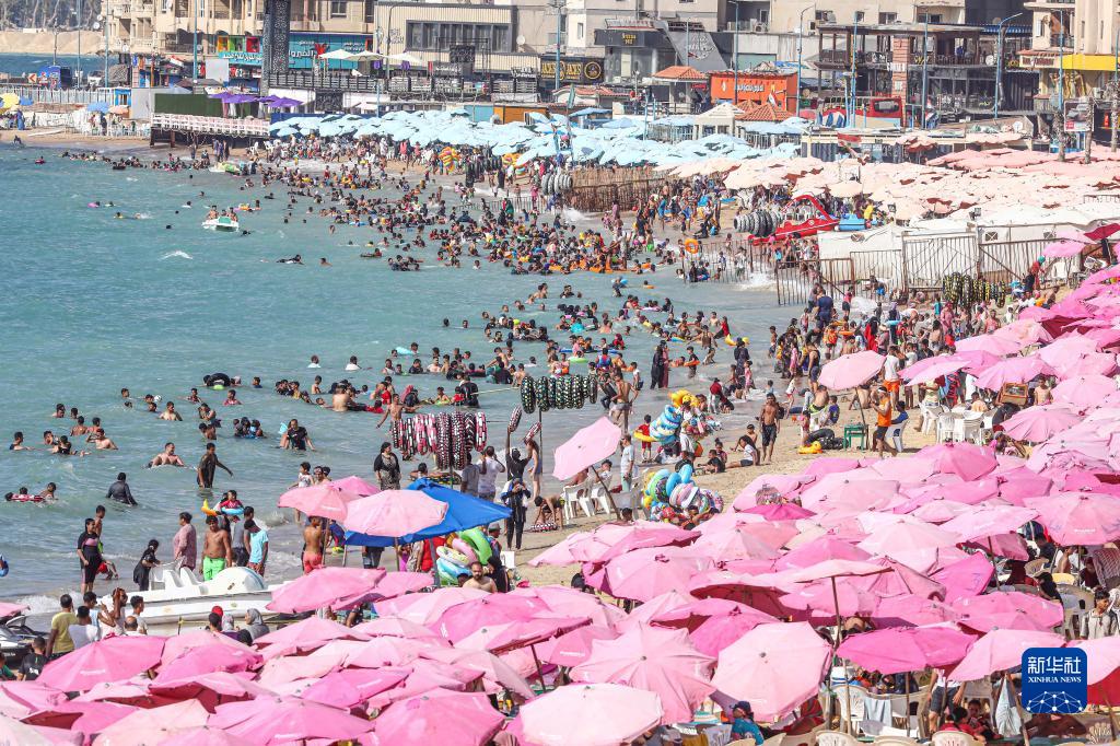 這是7月6日在埃及亞歷山大拍攝的人們在海邊避暑的場景。
