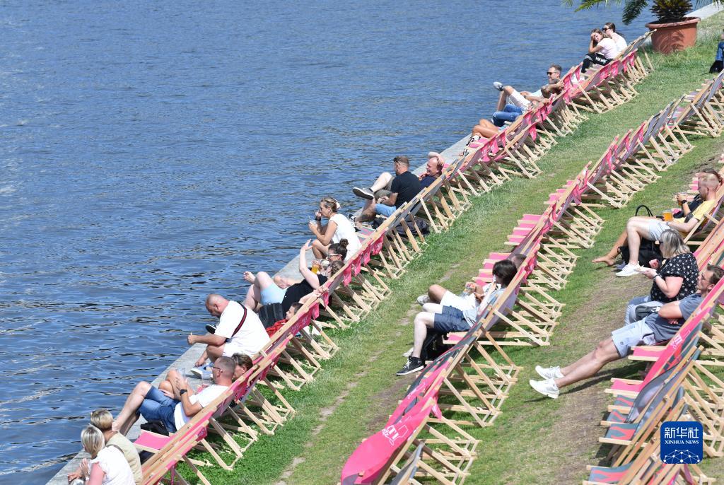 7月13日,人們在德國柏林施普雷河畔休閒。