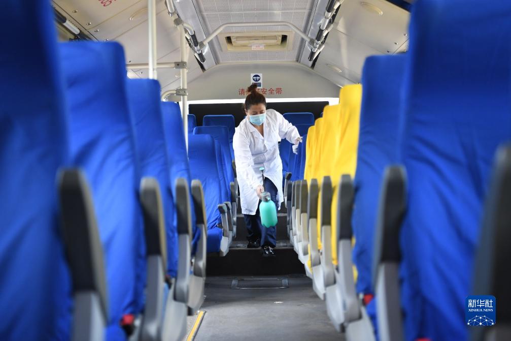 8月9日,河北省涿州市838路公交總站工作人員對車輛進行消毒。