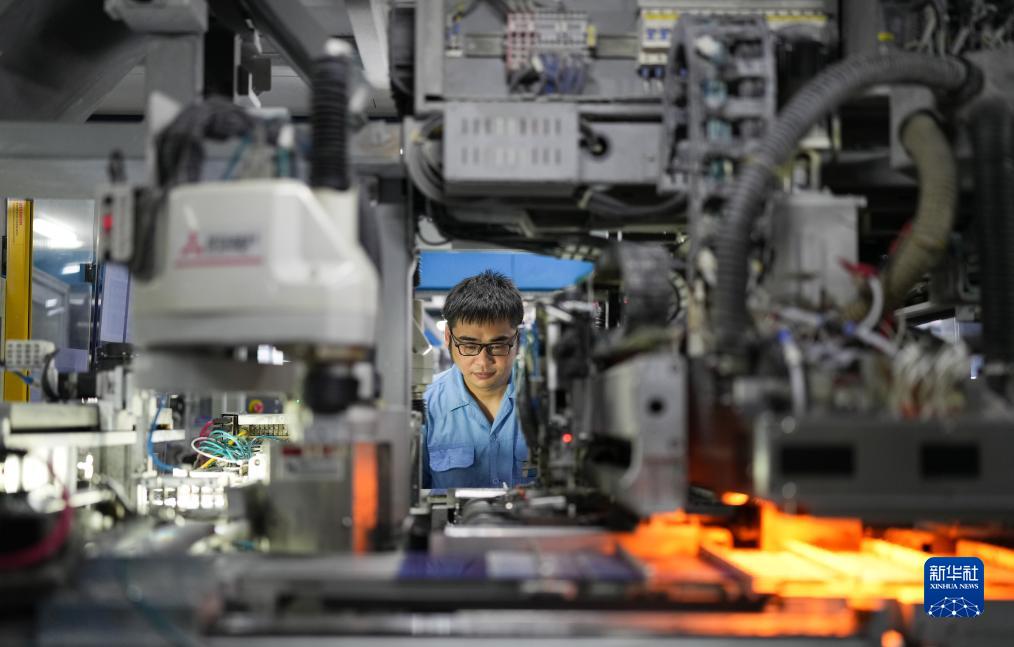 8月9日,在台州市黃岩區省級專精特新“小巨人”企業浙江公元新能源科技股份有限公司,工作人員操作全自動焊接機生産太陽能電池片。