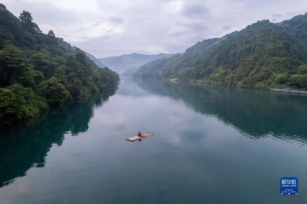8月9日,一隻小船漂浮在資興市東江湖風景區小東江上(無人機照片)。