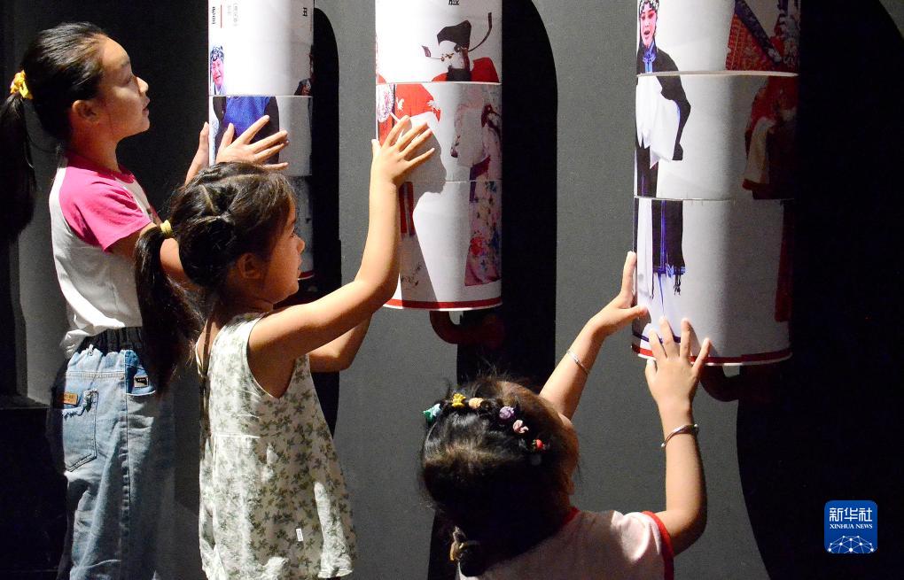 小朋友在中國秦腔藝術博物館裏感受游戲互動裝置(8月8日攝)。