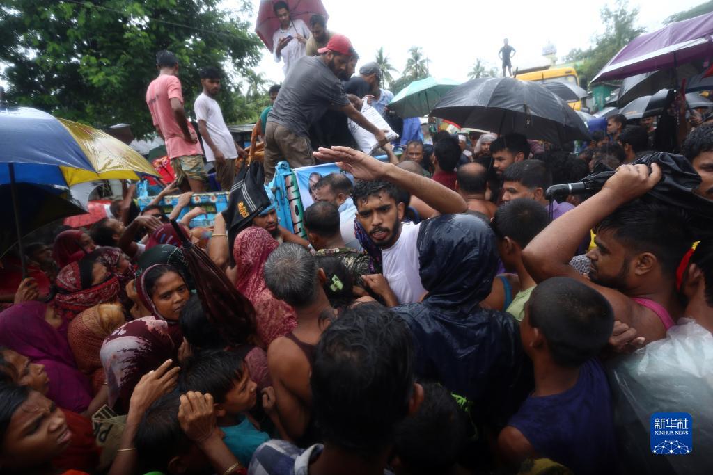 8月8日,人們在孟加拉國吉大港領取救援物資。
