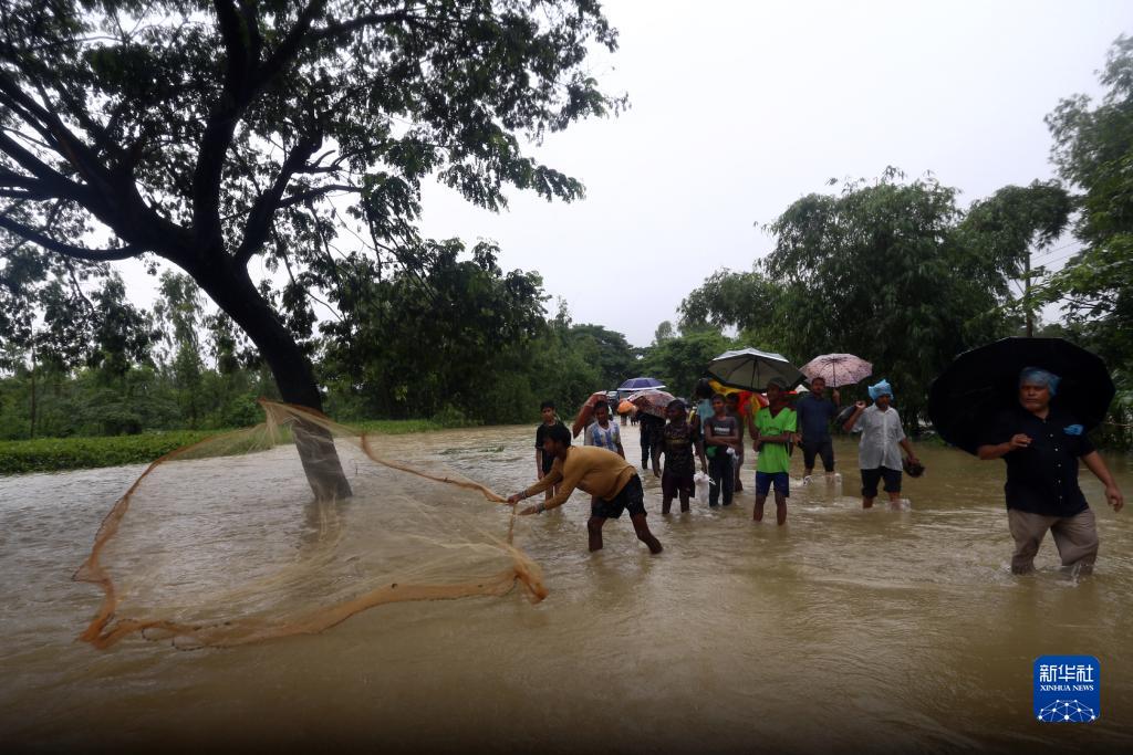 8月8日,在孟加拉國吉大港,人們在積水的道路上捕魚。