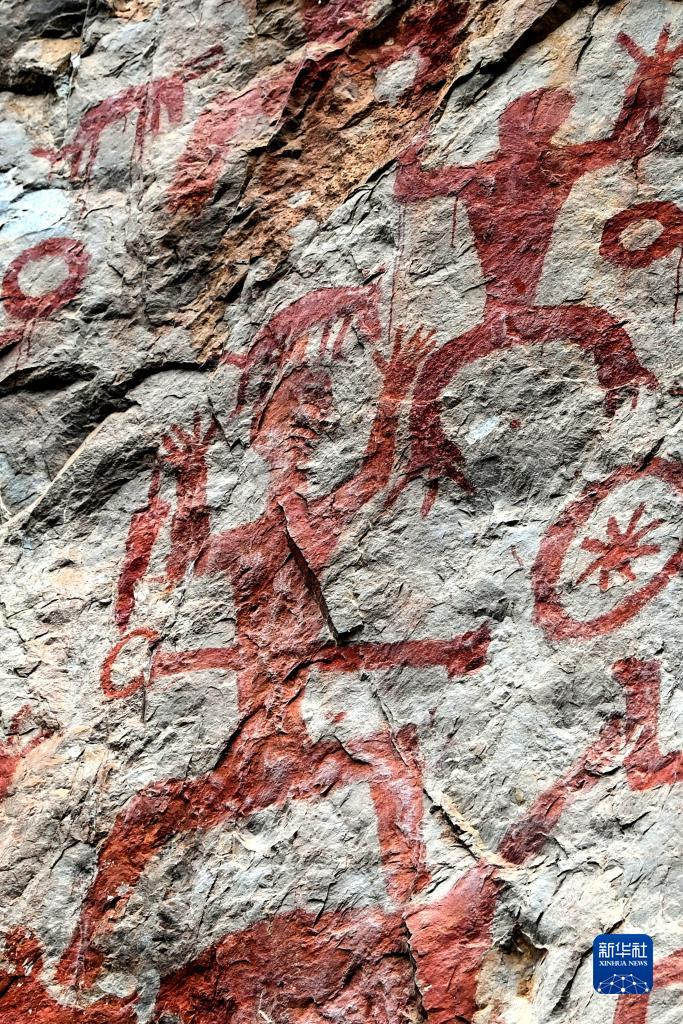 這是廣西崇左市寧明縣的花山岩畫,畫面表現的是某種儀式(8月8日攝)。