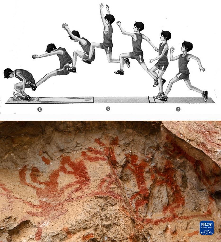 拼版照片,上圖為跳遠的分解動作;下圖為花山岩畫局部,看上去很像跳遠的分解動作(8月8日攝,新華社記者費茂華攝)。