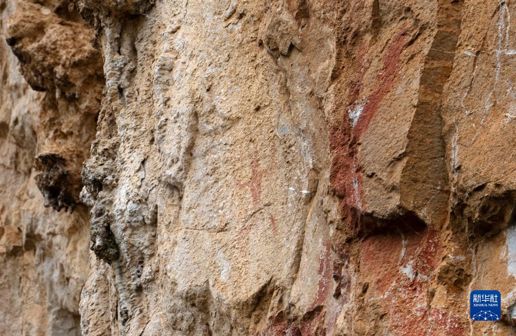 岩畫局部,這是目前花山岩畫中發現的最小的人像,僅有20厘米左右(8月8日攝)。