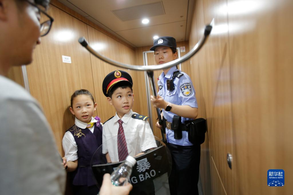 8月8日,南京鐵路公安處乘警支隊民警為小列車長們介紹反恐演練器材。