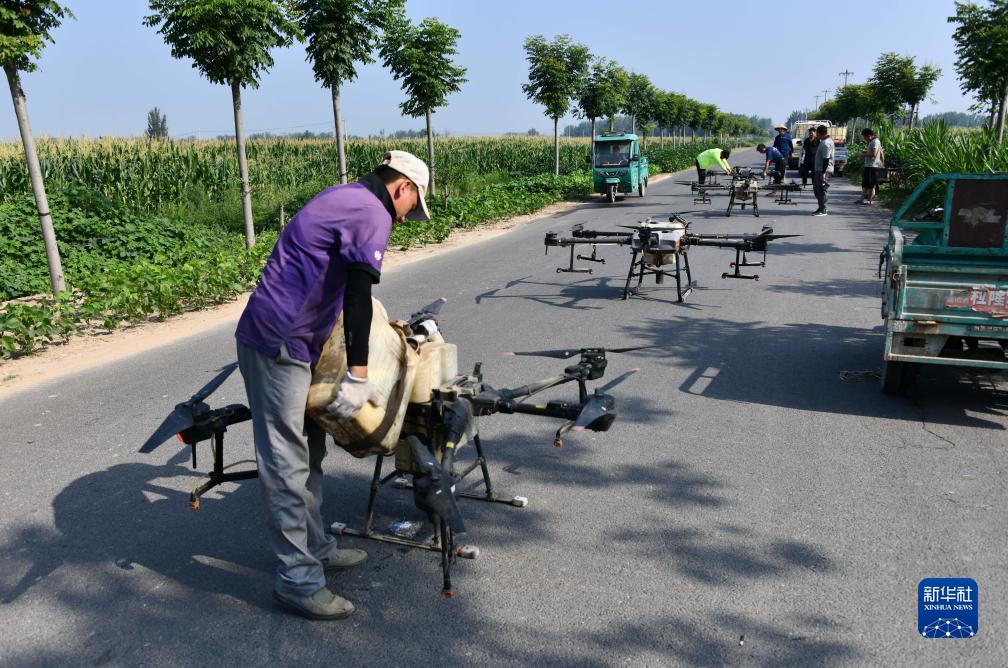 8月9日,在山東省成武縣孫寺鎮,無人機操作手在做起飛前的準備工作。