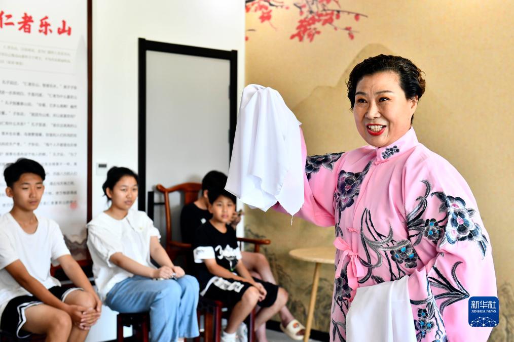 8月9日,在棗莊市市中區龍山路街道辛莊社區,棗莊市藝術劇院柳琴戲市級非遺傳承人郭曉玲在為孩子們表演柳琴戲。