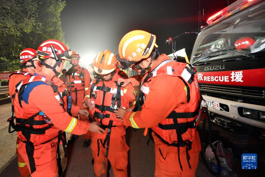 8月9日凌晨,在天津市靜海區&頭鎮,天津消防救援總隊的消防員在巡查前互相整理裝備。