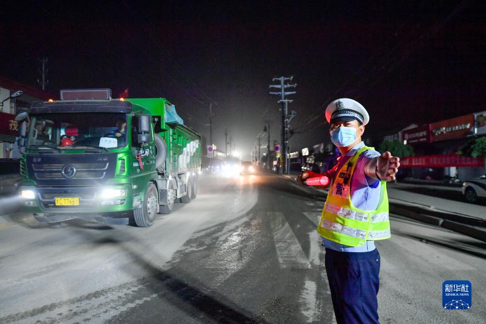 8月9日凌晨,交警在天津市靜海區&頭鎮一處十字路口指揮工程車輛進入作業現場。