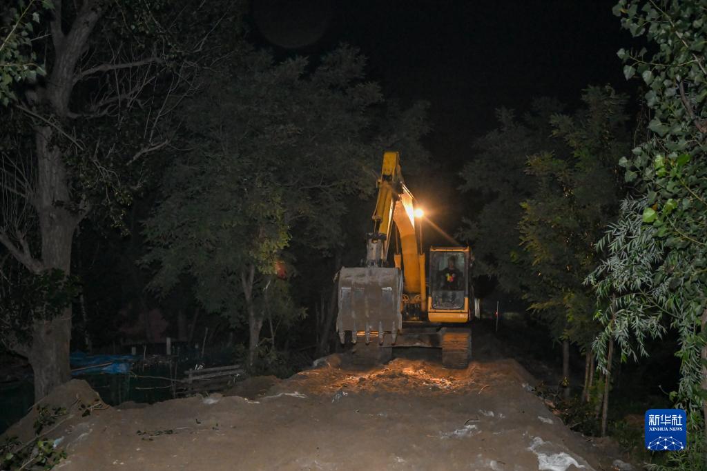 在天津市靜海區大清河&頭段南堤,大型工程機械夜間作業加固堤壩(8月7日攝)。