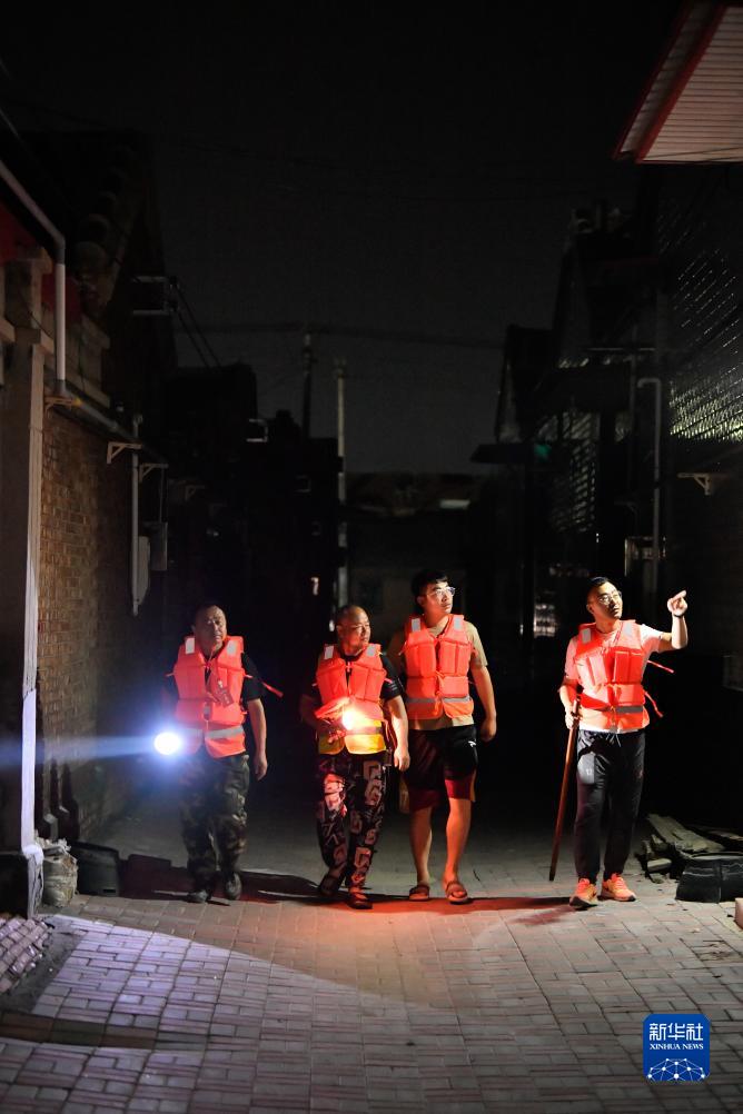 天津市靜海區&頭鎮民生村村幹部和留守人員在村莊內巡查(8月7日攝)。