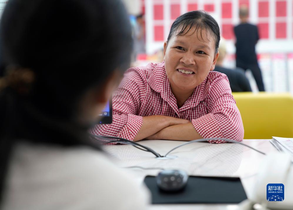 8月9日,求職者在浙江省金華市婺城區零工服務中心內與工作人員交流。