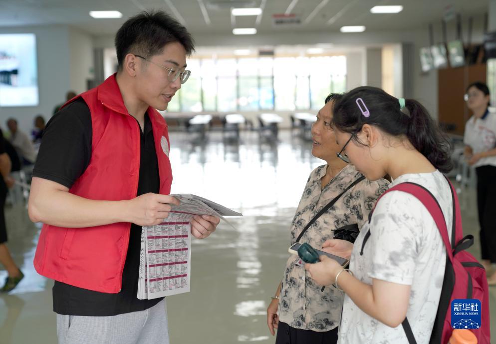 8月9日,浙江省金華市婺城區零工服務中心,一名零工引導員(左)向求職者介紹情況。