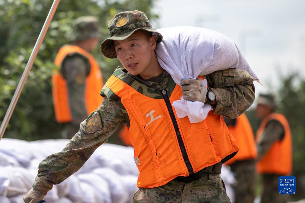 裝滿沙袋,扛上肩頭,疾速前進……一名名年輕官兵身穿迷彩服和救生衣,將一個個白色沙袋築成一道長約兩公里的“白色長城”。8日正午時分,在黑龍江省哈爾濱市雙城區萬隆鄉增産村,來自陸軍第78集團軍某旅的800余名官兵奮戰在抗洪一線。