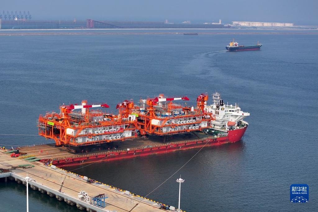 這是8月9日在天津濱海新區拍攝的渤中19-6凝析氣田I期開發項目組塊裝船作業現場(無人機照片)。組塊裝船後將赴渤海西部海域,進入海上安裝和聯調階段。