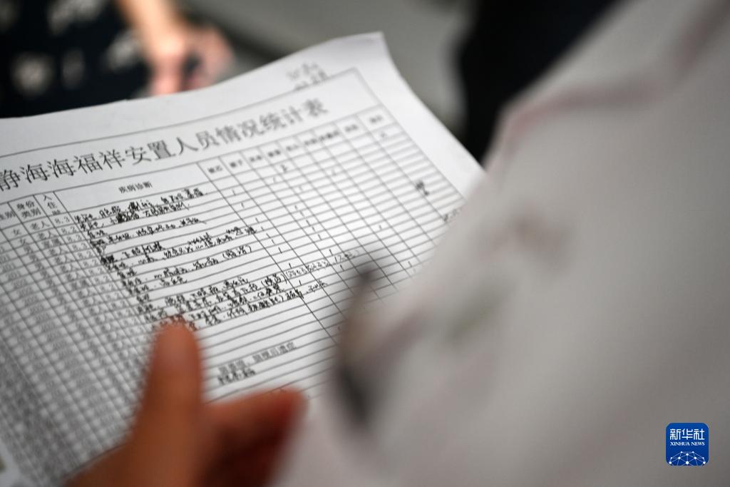 8月9日,工作人員在海福祥養老護理院安置點查看登記安置人員患病情況的統計表。