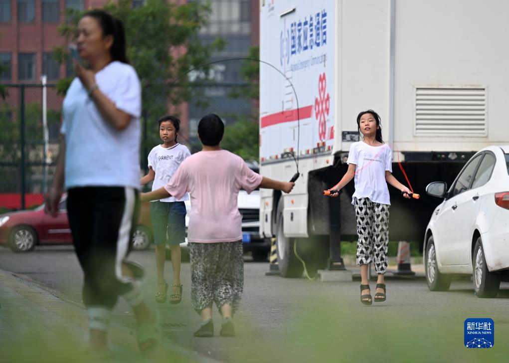 8月9日,小朋友在靜海六中安置點跳繩玩耍。