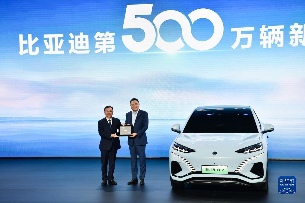 8月9日,比亞迪股份有限公司董事長兼總裁王傳福(左)將鑰匙交給第500萬輛新能源汽車車主。新華社記者 梁旭 攝