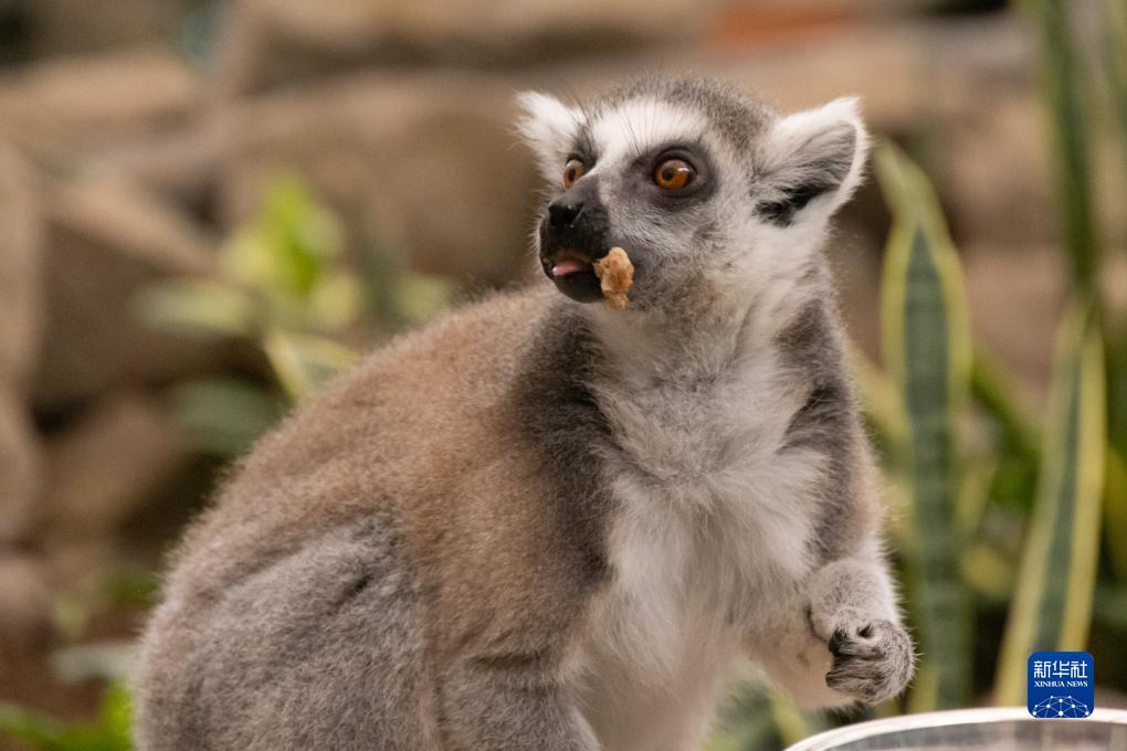 8月9日,在匈牙利布達佩斯動物園,環尾狐猴品嘗特製蛋糕。