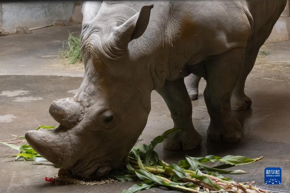 8月9日,在匈牙利布達佩斯動物園,白犀牛品嘗特製蛋糕。
