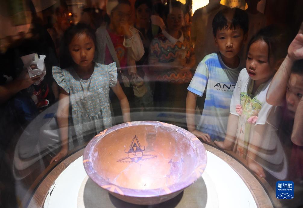 參觀者在西安半坡博物館裏觀看人面網紋彩陶盆(8月9日攝)。