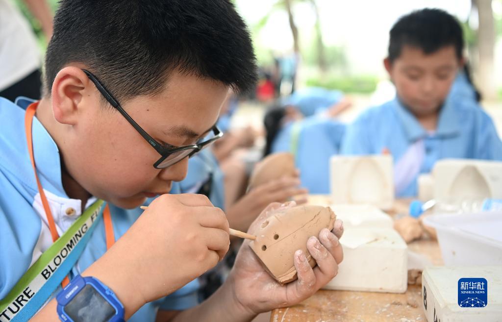 研學學生在西安半坡博物館裏製作陶塤(8月9日攝)。