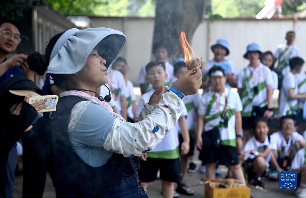 西安半坡博物館的工作人員向研學學生展示鑽木取火(8月9日攝)。