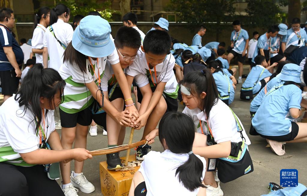 研學學生在西安半坡博物館裏體驗鑽木取火(8月9日攝)。