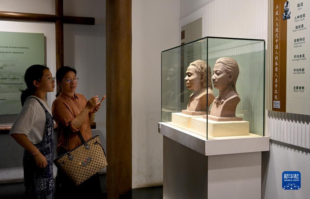 參觀者在西安半坡博物館裏了解半坡人的特徵(8月9日攝)。