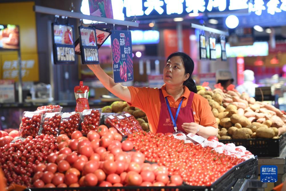 8月10日,涿州市惠友超市鑽石廣場店工作人員在調整標價牌。