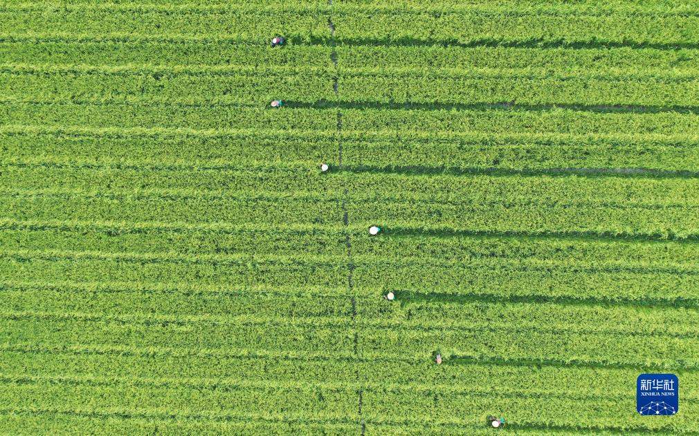 8月5日,四川省眉山市東坡區復興糧經現代農業園區,村民在水稻制種田裏開展去雜作業(無人機照片)。