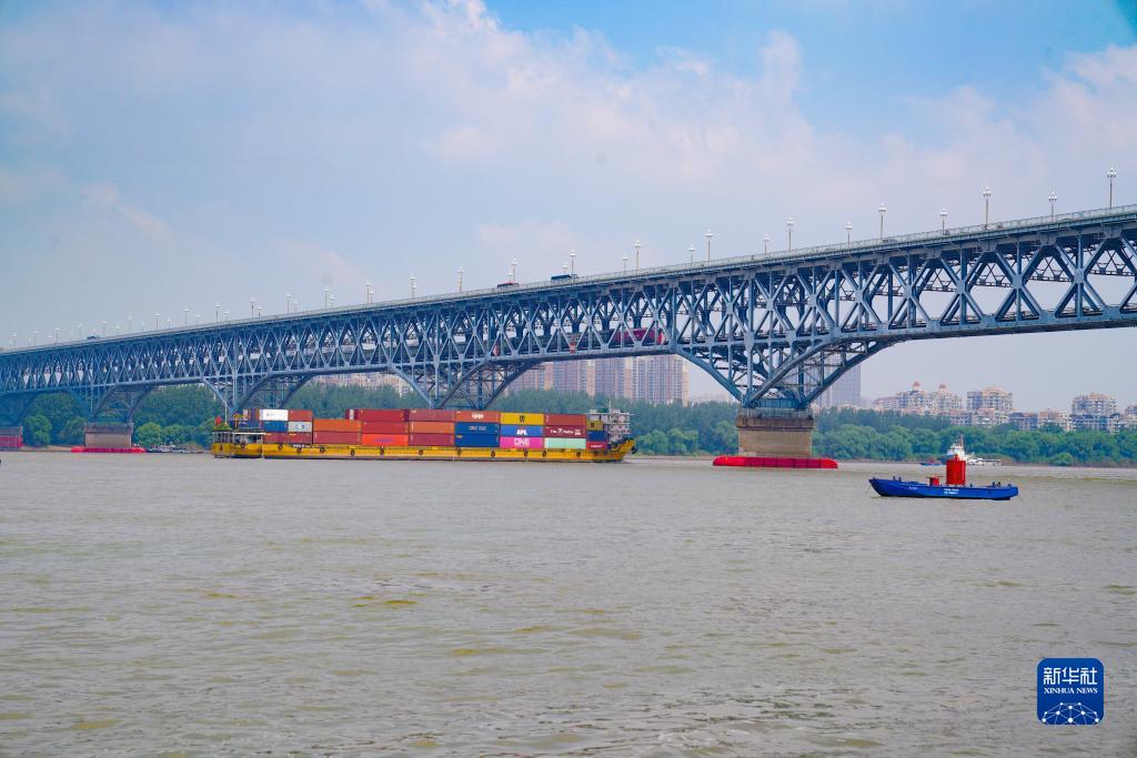 8月10日,一艘貨輪從南京長江大橋橋墩旁通過。